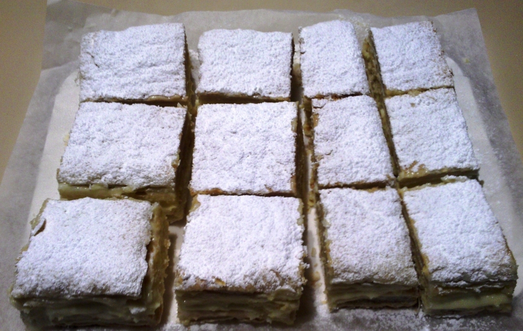 Non ci resta che assemblare il tutto: appoggiamo su di un vassoio la pasta sfoglia, cospargiamo bene con la crema preparata.